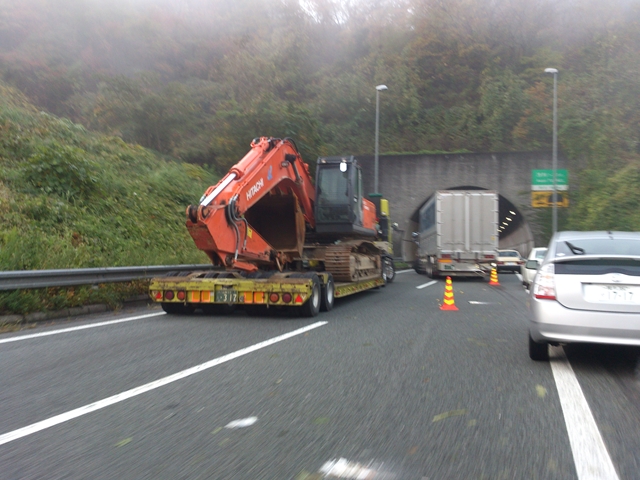 ユンボ回送トレーラーと大型トラックがゴッチンして2車線とも通れなくなっておりました。