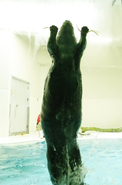 ガラスに貼り付けたイカをジャンプして取ります