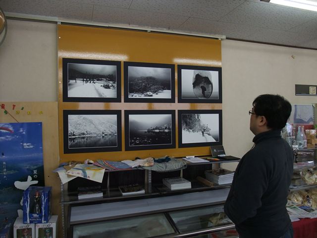 雪の木崎湖を眺めながら、雪の木崎湖の写真を見るなんて・・・